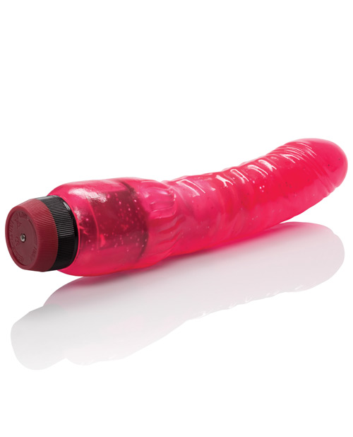 This dildo is much more than just a glittery, hot pink jelly dong. It’s 6 1/2 ” of curved, vibrating pleasure in a pretty penis package. The pliable material feels so good inside as the vibrator stimulates in all the right places. Twist bottom controls speed and intensity of dildo sensations, leading to an explosive climax.
