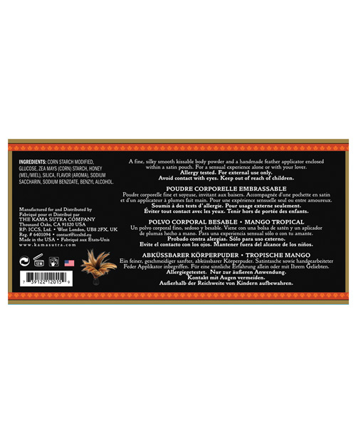 Kissable, moisture-wicking body powder that leaves skin silky-soft and delicately scented. Includes a sexy feather applicator. Lightweight formula wicks away moisture, leaving skin soft and smooth. Use anywhere on the body. Vanilla Creme: Creamy vanilla flavor. Reminiscent of fresh baked sugar cookies. Ingredients: CORN STARCH MODIFIED, GLUCOSE, ZEA MAYS (CORN) STARCH, HONEY (MEL/MIEL), SILICA, FLAVOR (AROMA), SODIUM SACCHARIN, SODIUM BENZOATE.