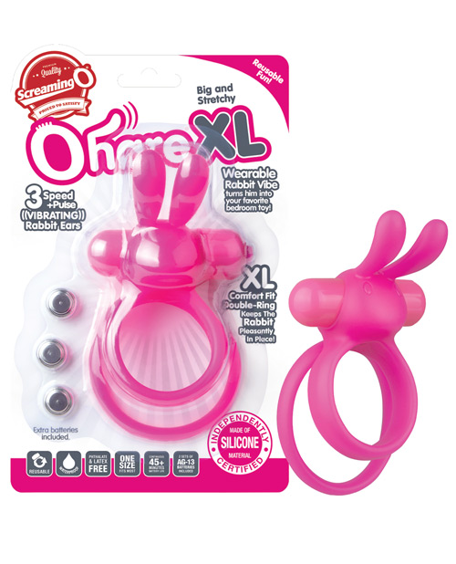 The Ohare XL is a slightly larger version of the best-selling vibrating couples ring made famous for its clever and familiar shape! This unique vibrating ring turns him into your favorite rabbit vibe with larger comfort-fit rings and a super-powered 4-function motor enhanced with soft, flexible rabbit ears! Made of lab-tested body-safe silicone, these ears transfer vibration all the way to their tips for a pleasant tickling sensation that helps heighten arousal and make orgasms come easier during intercourse. The Ohare XL is most unique for its double-ring design, which helps keep the rabbit in place; one ring stretches around the shaft and the second stretches around the shaft and testicles, giving him an effective isolation fit that many users report enhances erections and intensifies orgasms. The Ohare XL excites and delights with an iconic shape she loves and comfortable erection enhancement he craves! Pink. From Screaming O.