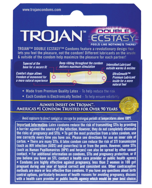 Trojan Double Ecstasy Condoms feature a revolutionary design that lets you feel the pleasure, not the condom! Different lubricants on the inside and outside of the condom help maximize the pleasure for each partner. Tapered at the base for a secure fit. Comfortable shape allows freedom of movement for a more natural experience. Deep ribbing throughout the condom delivers maximum stimulation. From Trojan.