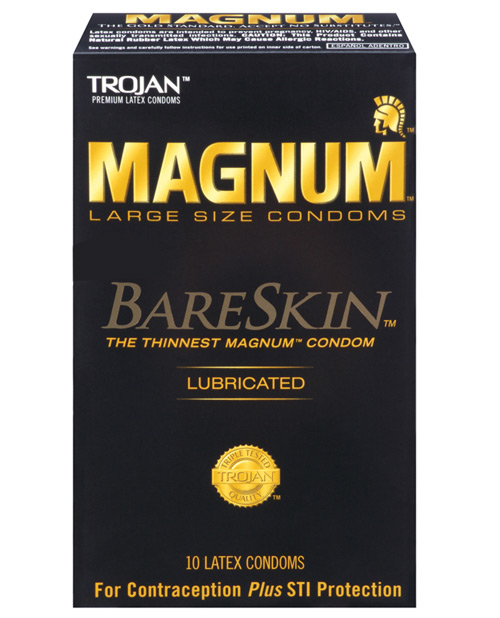 Trojan Magnum BareSkin Lubricated Condoms. The thinnest Magnum condom, designed to provide heightened sensitivity and comfort. Wider, contoured shape for added comfort. Tapered at the base for a secure fit. Silky-smooth lubricant for comfort and sensitivity. Made from premium quality latex to help reduce risk. Each condom is electronically tested and meets U.S. standards for strength to help ensure reliability.